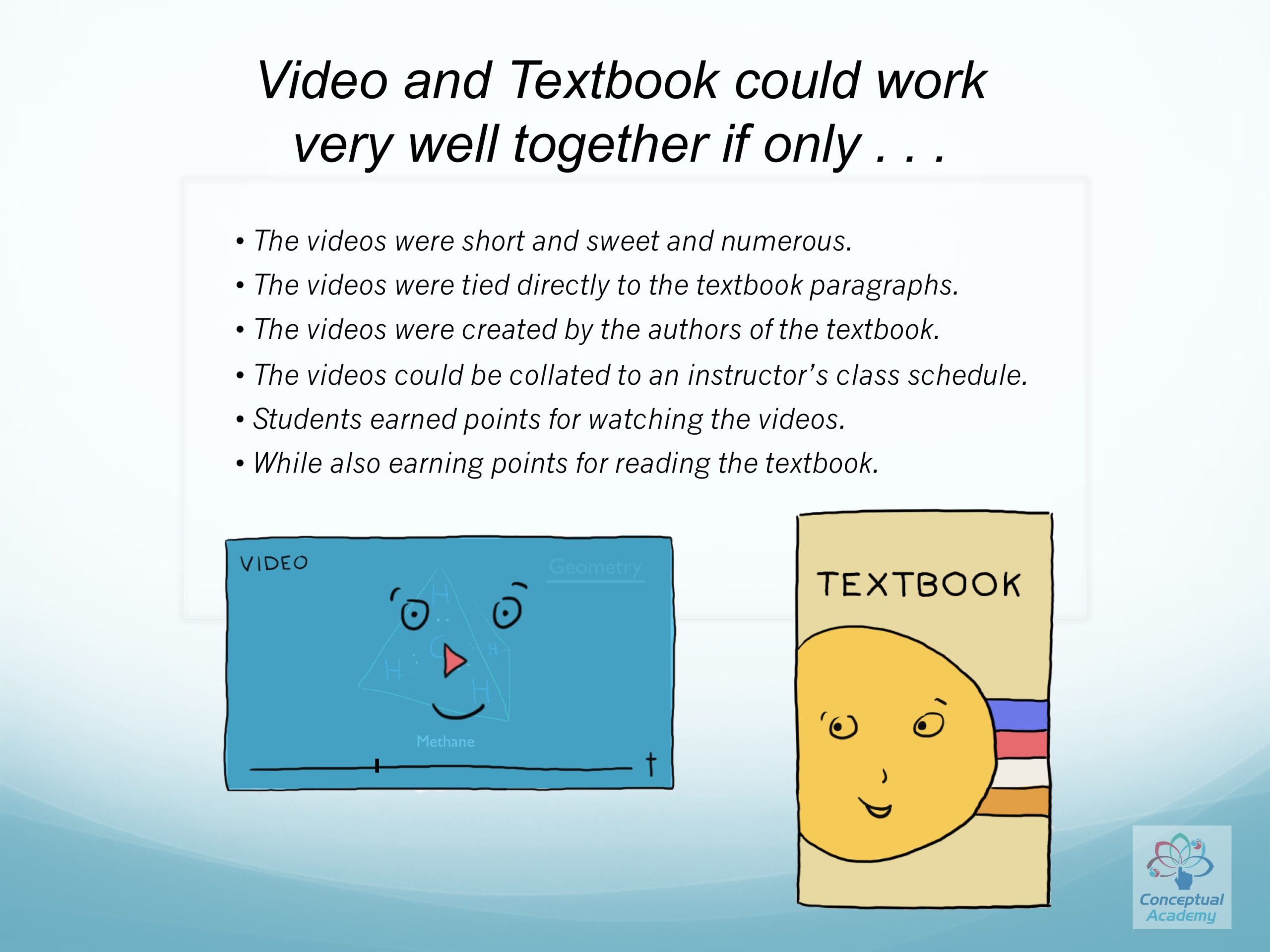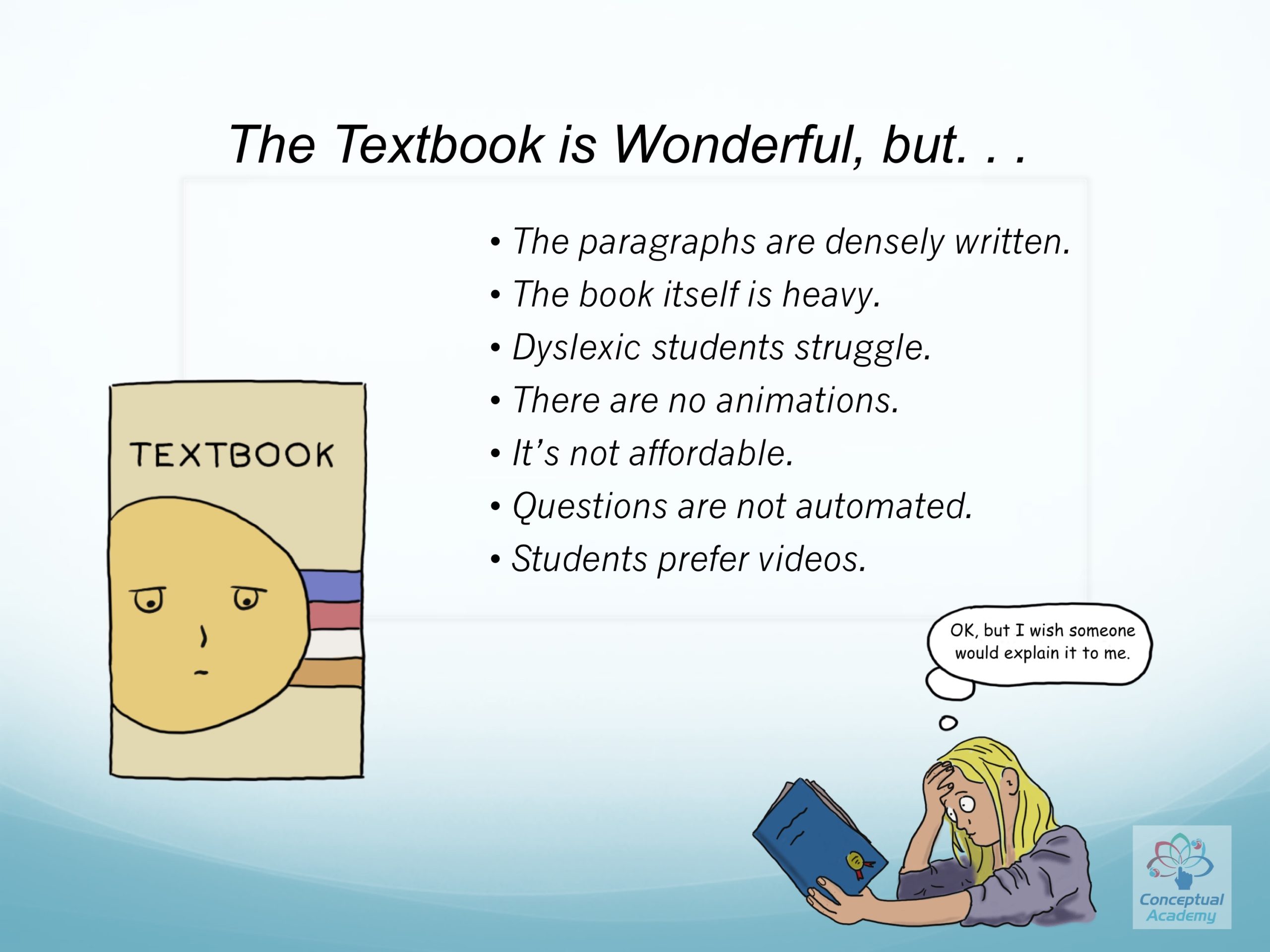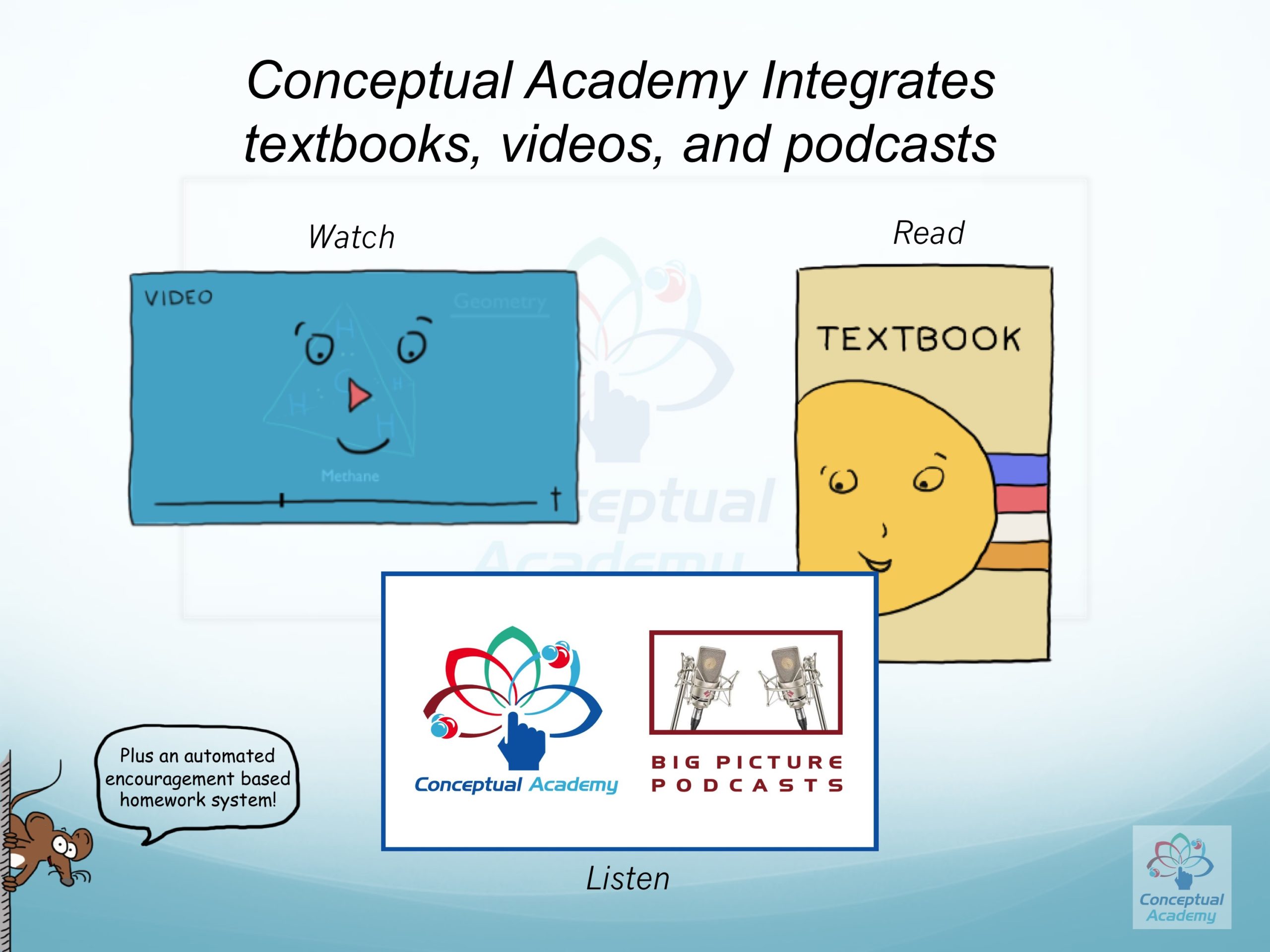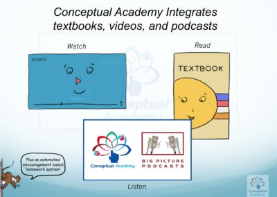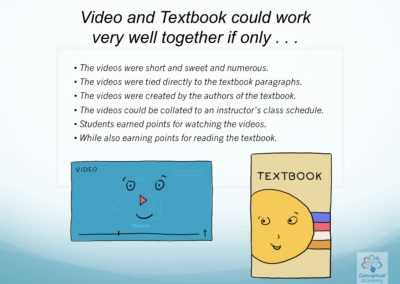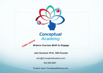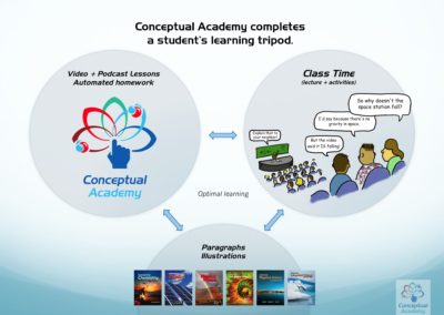 We are a company of college science professors who are also science textbook authors and producers of educational videos, podcasts, and other instructional materials. Our premise is that students embrace video as a means of learning. We have thus developed a video-centric and interactive platform we call Conceptual Academy.