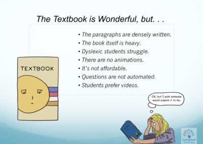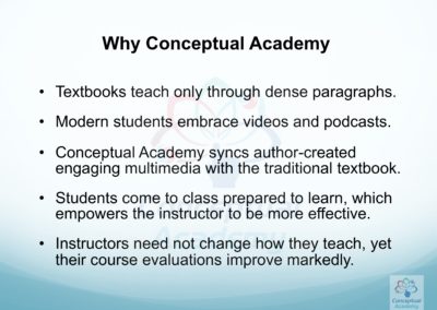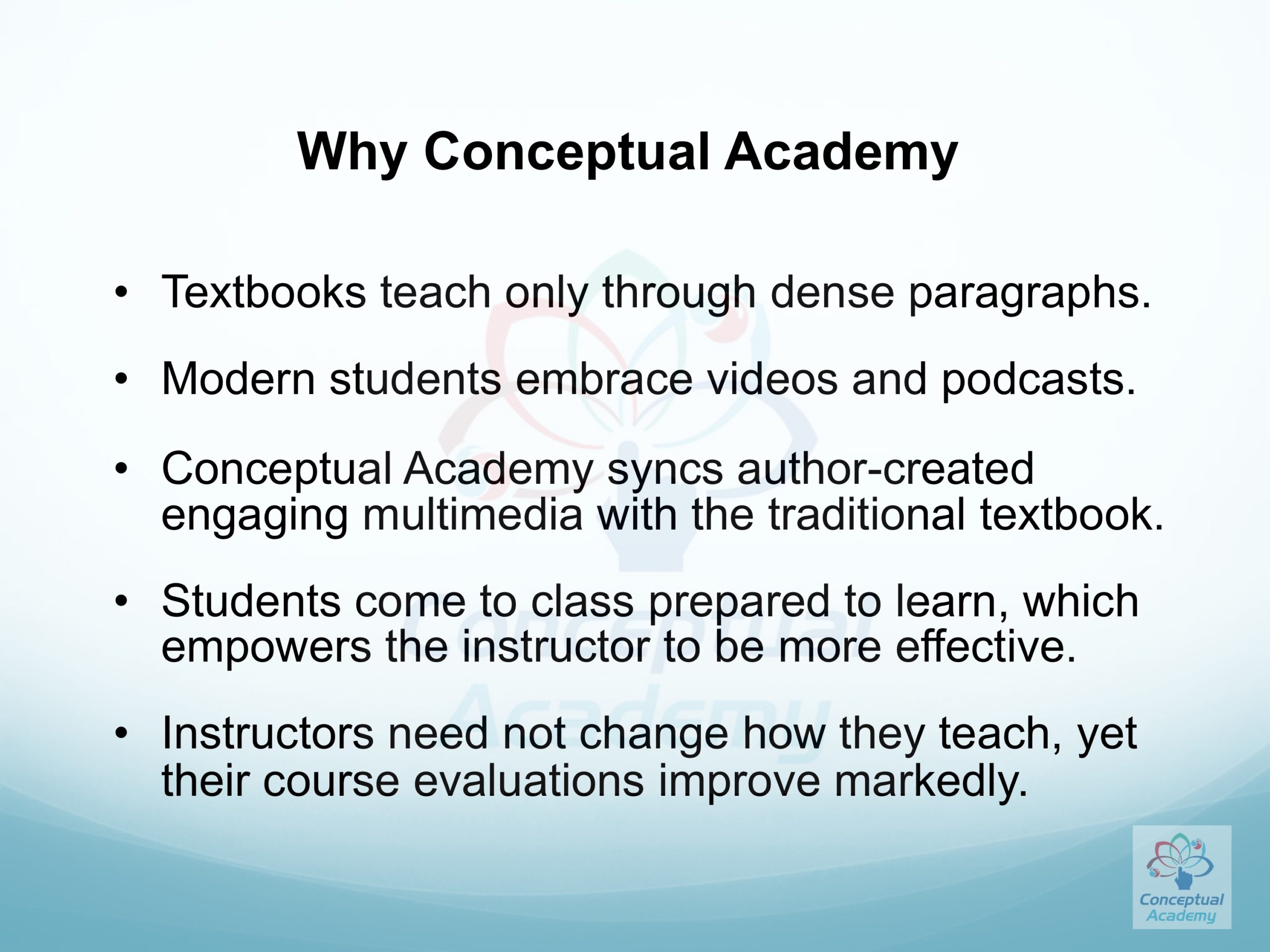Our extensive multimedia is housed within a platform called Conceptual Academy  which we created independent of our textbook publisher. Conceptual Academy pulls from our growing library of multimedia to create interactive and customized courses matching the syllabus of each instructor using one of our textbooks, or even a competing textbook, and in a growing number of cases: no printed textbook at all.