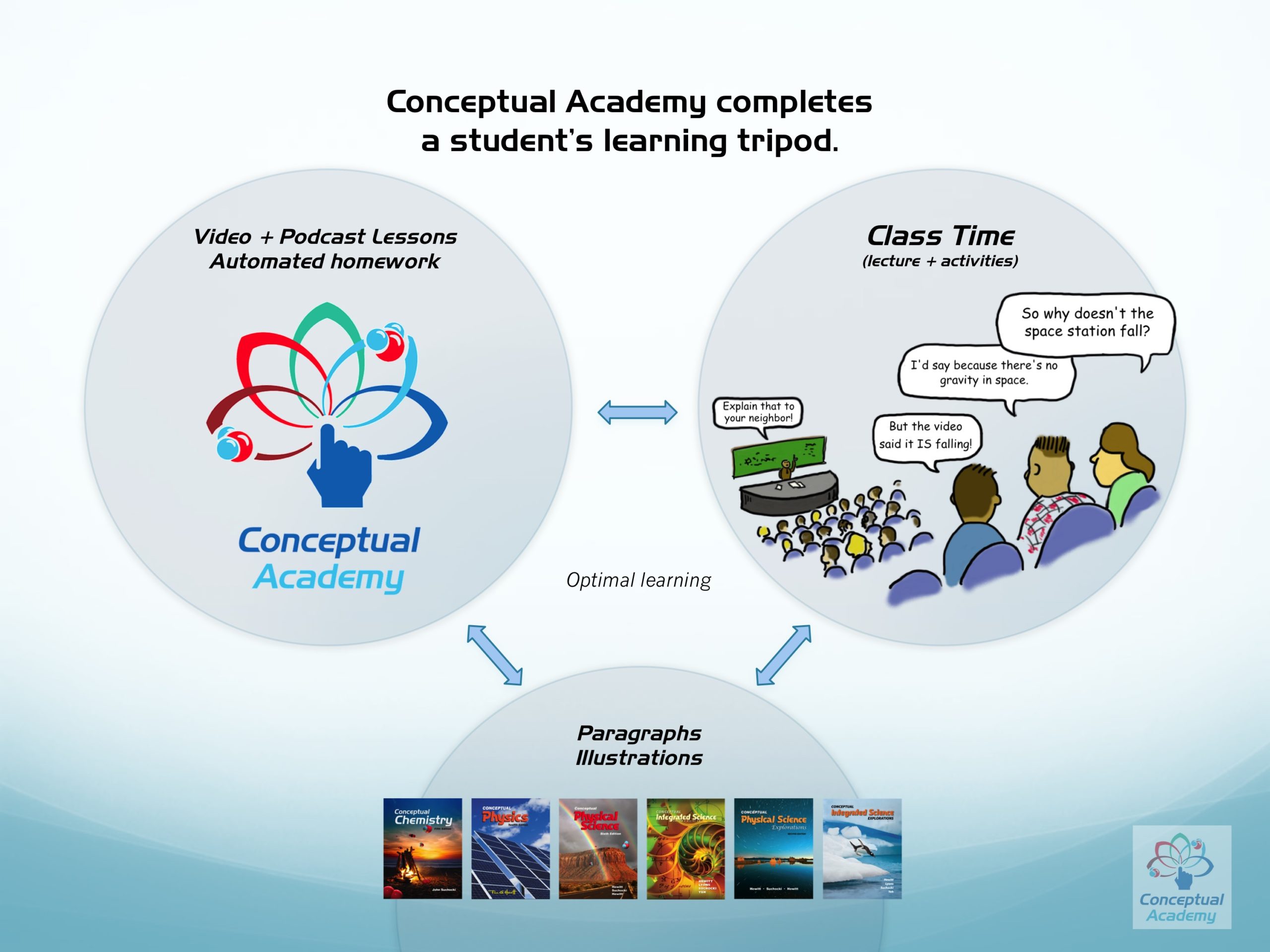 Conceptual Academy also offers an innovative and unique “encouragement-based” and automated homework system, described in more detail at our instructor support site: ConceptualScience.com.