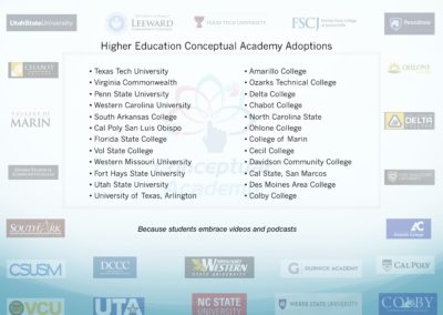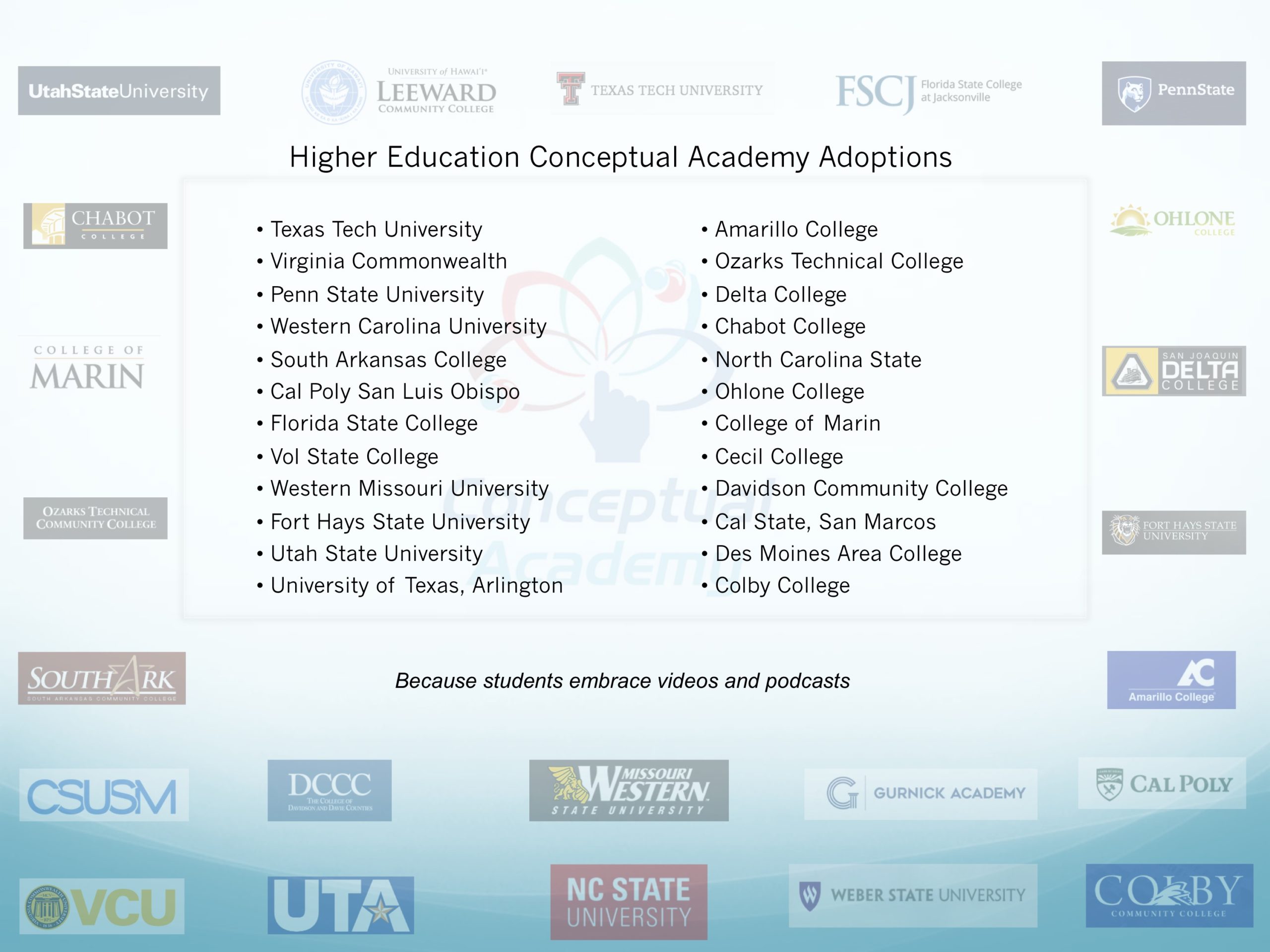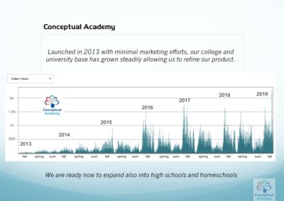 Conceptual Academy hosts our multimedia content including our “video textbooks”, which are the video versions of our traditional textbooks printed by Pearson. Launched in 2013 and funded by ourselves and growing revenues, Conceptual Academy has developed into a mature and proven product now being used within three key marketing channels: universities/colleges, high schools, and homeschools.