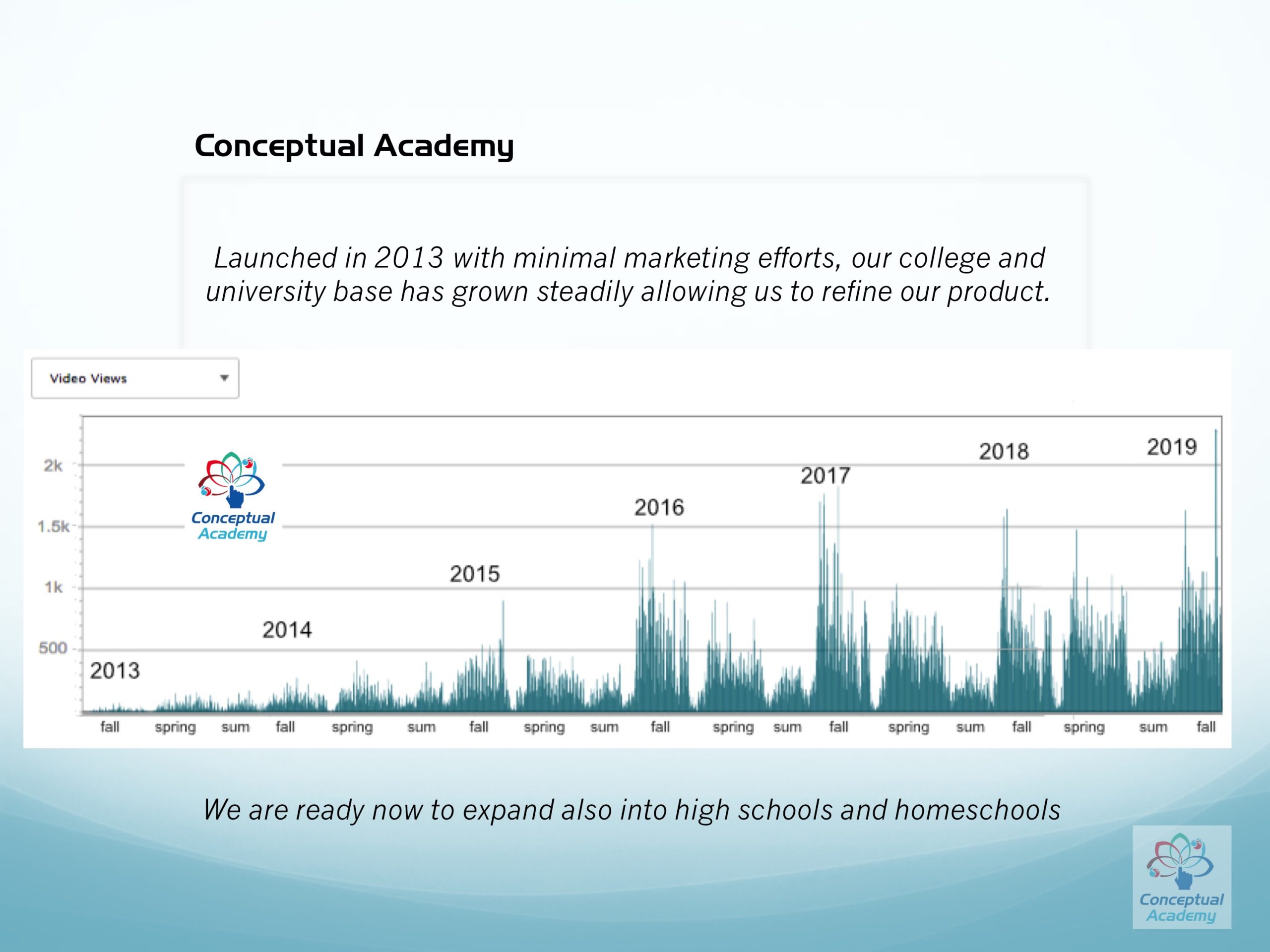 In summary, Conceptual Academy is our platform for the video versions of our textbooks, which are already well-known for the deep impact they have had in the science education world. Our initial aim is marketing to the many instructors already using our conceptual curricula. To us, Conceptual Academy is our next-level opportunity. It is our passion. It is the next-generation, based upon what actually works for the instructor and student both inside and outside the classroom.